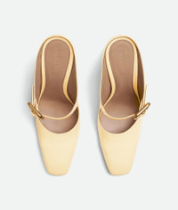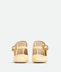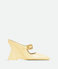 Patent leather Mary-Jane mule pumps. Product details • Patent leather Mary-Jane mule pumps Material: 100% Calfskin • Lining: Lambskin • Color: Camomille • Hardware: Gold finish • Bio-based rubber-injected and biodegradable leather outsole • Heel: 10 cm | 3.9" Made in: Italy