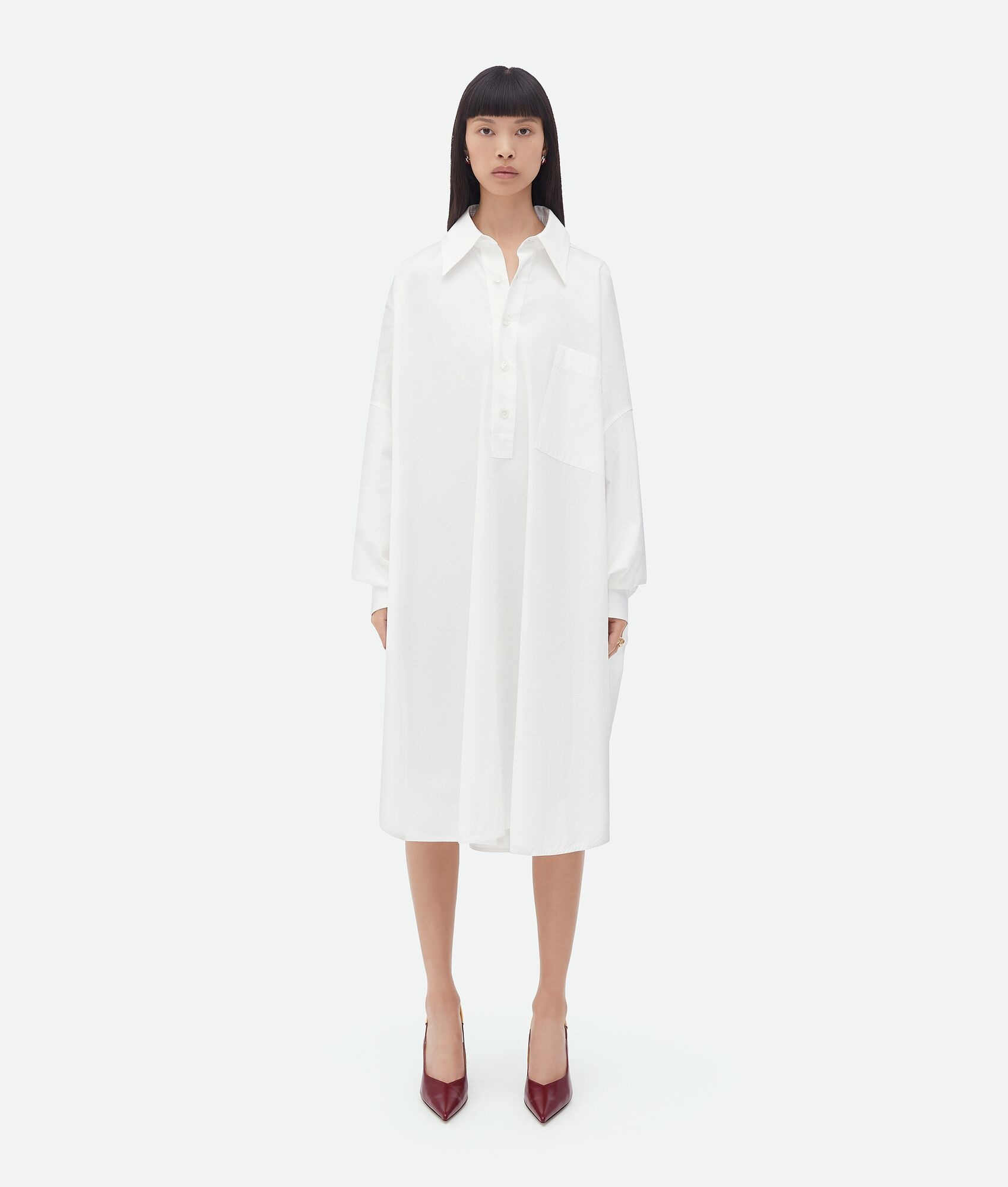 Compact cotton dress. Product details • Compact cotton dress • Button closure • Unlined • Relaxed fit Material: 72% Cotton, 20% Viscose, 8% Polyester • Color: Chalk Made in: Italy Size & fit • Model is 177 cm | 5'9" and is wearing a Bottega Veneta size 38