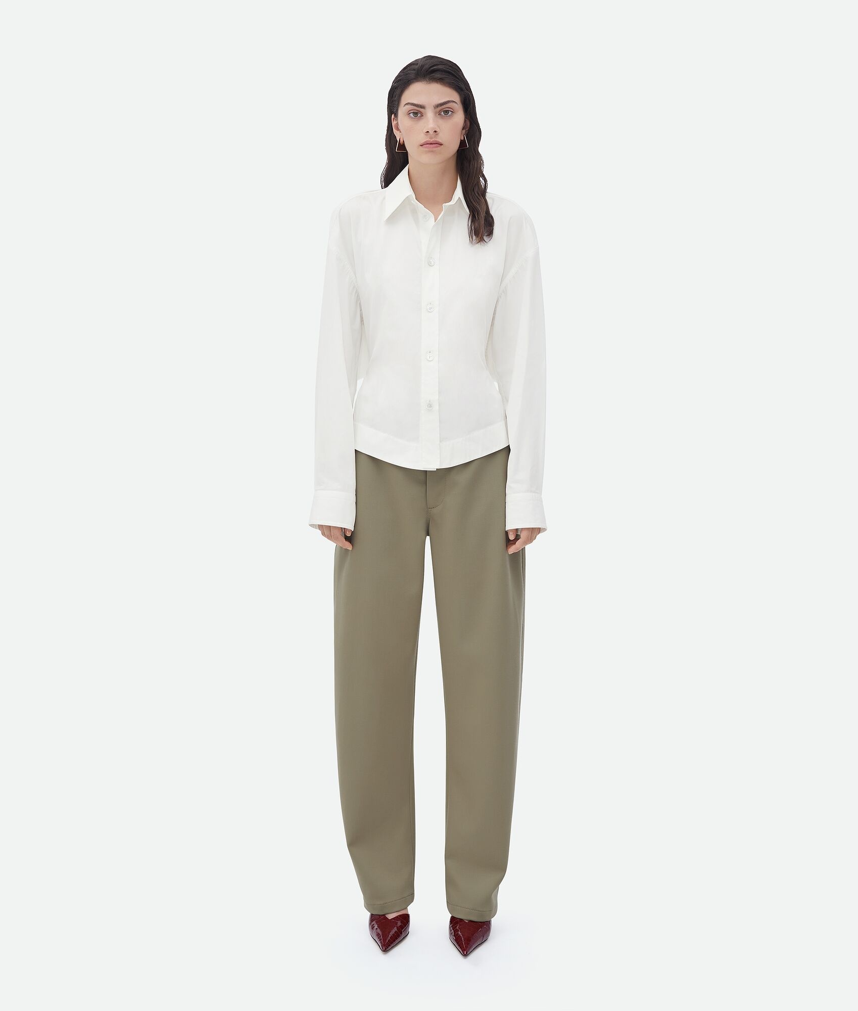 Compact cotton shirt. Product details • Compact cotton shirt • Button closure • Unlined • Slim fit at waist with balloon volume at back Material: 20% Viscose, 80% Polyester • Color: Chalk Made in: Italy Size & fit • Model is 177 cm | 5'9" and is wearing a Bottega Veneta size 38