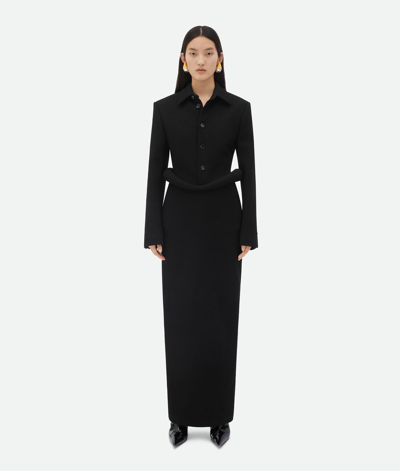 Long skirt with sculptural silhouette and padded hip construction realised in a very Product details • Compact viscose long skirt • Padded hip construction • Zipper closure • Unlined Material: 60% Viscose, 39% Polyamide, 1% Elastane • Color: Black Made in: Italy Size & fit • Model is 178 cm | 5'10" and is wearing a Bottega Veneta size 38
