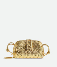 Product Details - Intrecciato embossed lamina leather pouch - One main compartment, one interior flat pocket - Zipper closure with leather puller - Adjustable leather tubular strap with sliding knots - Lining: Lambskin - Color: Gold - Hardware: Gold finish - Made in: Italy - Product code: 794258V5XY08472 Material - Material: Calfskin, lambskin Size & Fit - Height: 11.5 cm | 4.5" - Width: 18.5 cm | 7.3" - Depth: 8.5 cm | 3.3" - Strap drop: 55 cm | 21.7"
