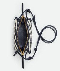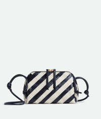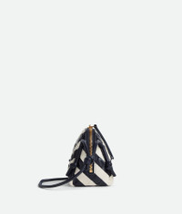 Intrecciato striped nappa leather pouch with adjustable tubular strap. Product Details - One main compartment, one interior flat pocket - Zip closure with leather zip puller - Adjustable leather tubular strap with sliding knots - Material: Calfskin - Lining: Calfskin - Colour: Space/Chalk - Hardware: Gold finish - Height: 11.5 cm - Width: 18.5 cm - Depth: 8.5 cm - Strap drop: 55 cm - Made in: Italy - Product code: 794258V5JR08882
