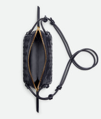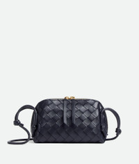 Product Details - Intrecciato nappa leather pouch - One main compartment, one interior flat pocket - Zipper closure with leather puller - Adjustable leather tubular strap with sliding knots - Lining: Calf leather - Color: Nocturnal - Hardware: Gold finish - Made in: Italy - Product code: 794258VCPP14183 Material - Material: Lambskin Size & Fit - Height: 11.5 cm | 4.5" - Width: 18.5 cm | 7.3" - Depth: 8.5 cm | 3.3" - Strap drop: 55 cm | 21.7"