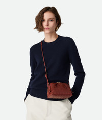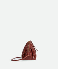 Intrecciato nappa leather pouch with adjustable tubular strap. Product Details - One main compartment, one interior flat pocket - Zip closure with leather zip puller - Adjustable leather tubular strap with sliding knots - Material: Lambskin - Lining: Calfskin - Colour: Sapele - Hardware: Gold finish - Height: 11.5 cm - Width: 18.5 cm - Depth: 8.5 cm - Strap drop: 55 cm - Made in: Italy - Product code: 794258VCPP12504