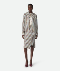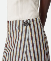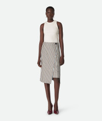 Skirt with wrapped silhouette in cotton and linen with bold striped design. Product Details - Cotton and linen bold striped wrapped skirt - Button closure - Color: Cloud/Fondant/Lava - Made in: Italy - Product code: 831818V5PI05259 Size & Fit - Model is 178 cm | 5'10" and is wearing a Bottega Veneta size 38