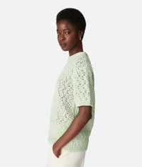 T-shirt in midweight cotton crochet knit. Product Details - Midweight cotton crochet knit t-shirt - Regular fit - Material: 100% Cotton - Color: Glacier - Made in: Italy - Product code: 785232V5SP03022 Size & Fit - Model is 179 cm | 5'10" and is wearing a Bottega Veneta size S