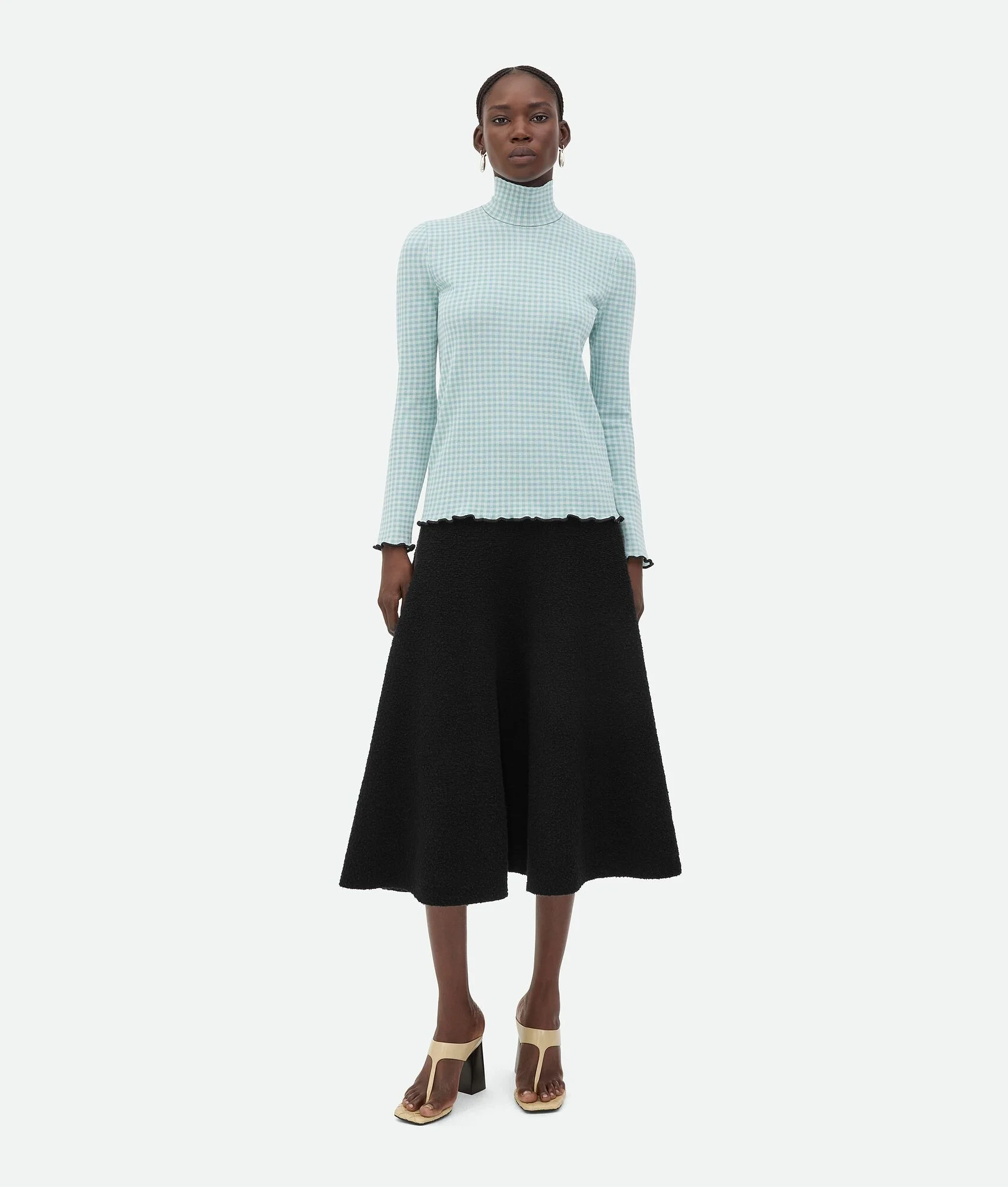 Top in lightweight underpinning cotton gingham. Product Details - Lightweight cotton vichy underpinning top - Zipper closure - Regular fit - Material: 82% cotton, 18% polyamide - Color: Celeste/Chalk - Made in: Italy - Product code: 816110V53O04569 Size & Fit - Model is 181 cm | 5'11" and is wearing a Bottega Veneta size S