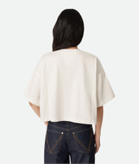 Cropped t-shirt in pima cotton jersey with Intrecciato suede patch. Product Details - Pima cotton jersey cropped t-shirt - Washable Intrecciato suede front patch - Regular fit - Color: Chalk - Made in: Italy - Product code: 840748V4N509071 Size & Fit - Model is 177 cm | 5'9" and is wearing a Bottega Veneta size S
