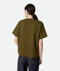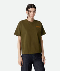 T-shirt in pima cotton jersey with Intrecciato suede patch. Product Details - Pima cotton jersey t-shirt - Washable Intrecciato suede front patch - Regular fit - Material: 100% Cotton - Color: Pine Green - Made in: Italy - Product code: 838925V4N503130 Size & Fit - Model is 178 cm | 5'10" and is wearing a Bottega Veneta size S