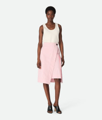 Midi skirt with wrapped silhouette in irregular washed cotton twill. Product Details - Washed cotton twill wrapped midi skirt - Button closure - Color: Camelia - Made in: Italy - Product code: 831818V5PB08176 Size & Fit - Model is 179 cm | 5'10" and is wearing a Bottega Veneta size 38