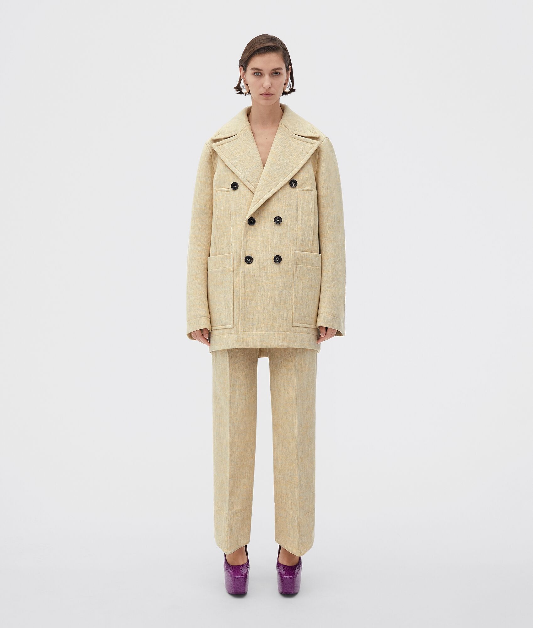 • Double melange wool coat • Curved shape • Button closure • Fully lined • Oversized fit Material: 35% Cotton, 35% Viscose, 25% Wool, 5% Polyamide • Color: Oatmeal Melange Made in: Italy