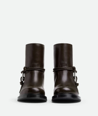 Ankle boot in calfskin leather with coaxial detailing and signature metal triangle. Product Details - Leather ankle boot - Coaxial detailing with signature metallic triangle element - Lining: Calf leather - Color: Fondant - Hardware: Silver finish - Leather outsole with Goodyear construction - Made in: Italy - Product code: 843951V60E02113 Material - Material: Calfskin, lambskin