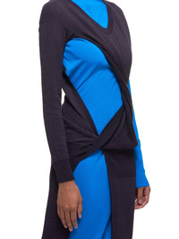 Bottega Veneta deconstructed dress in blue/dark purple, knitted two-tone layered design, woven mohair sweater with light viscose sweater underneath, long sleeves, finished hem, tonal stitching. Made in Italy. Composition - 37% Polyamide, 28% Cotton, 25% Mohair Wool, 10% Wool Model is 5ft 7” and wearing a size 38. Bust: 32” Waist: 25” Hip: 30”