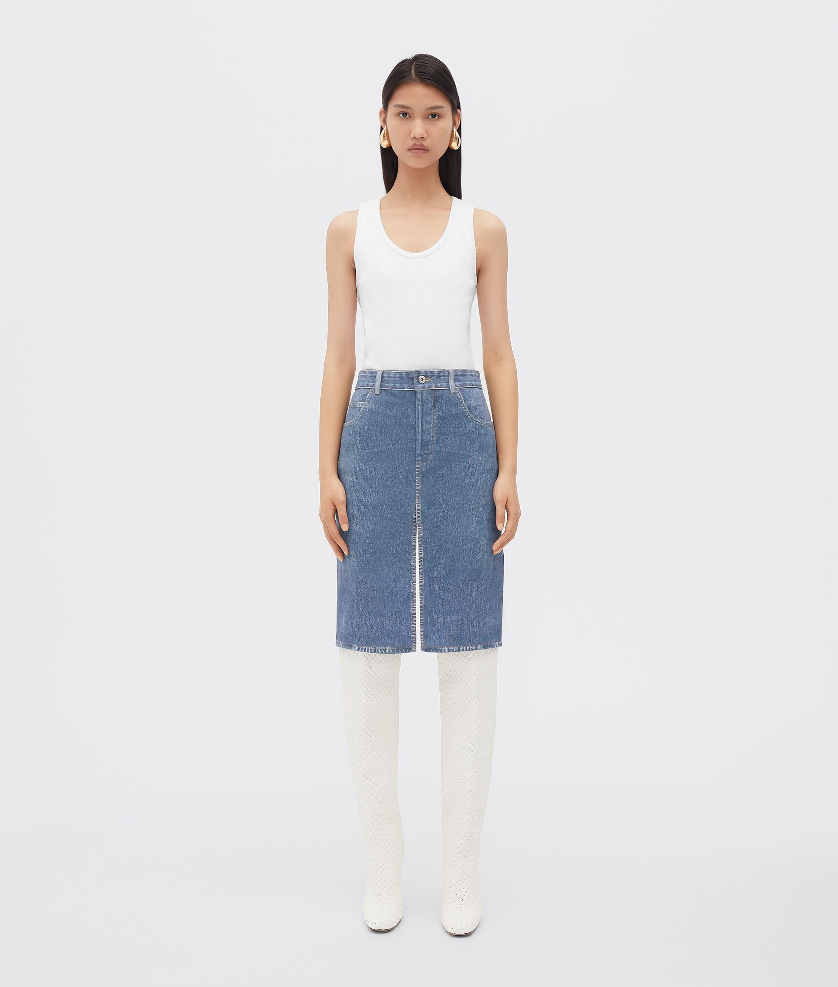 Printed leather midi skirt. Product details • Printed leather midi skirt • Denim effect • Button closure • Straight leg Material: 100% Calfskin • Color: Medium Blue Denim Made in: Italy Size & fit • Model is 180 cm | 5'11" and is wearing a Bottega Veneta size 38