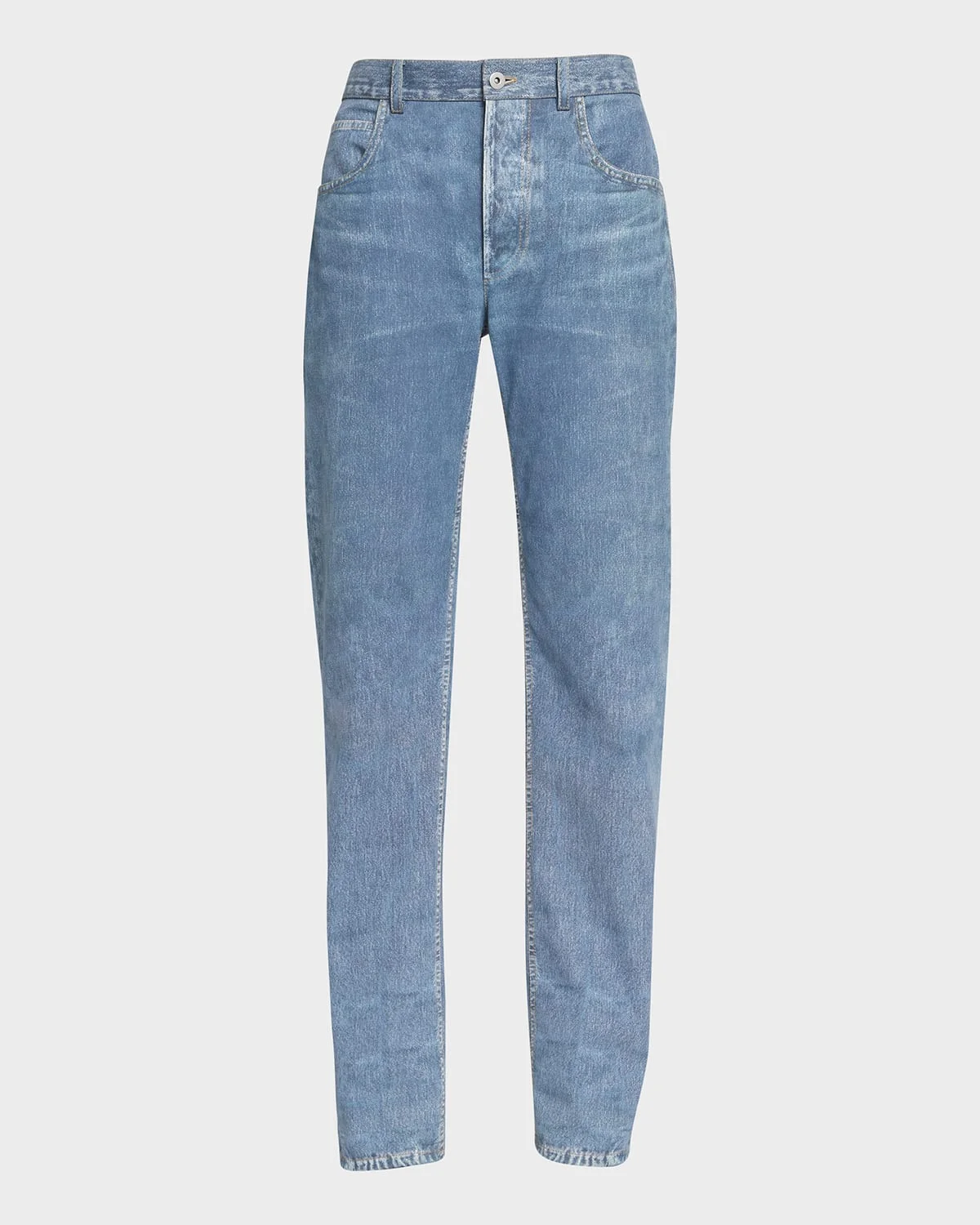 Bottega Veneta denim printed nubuck pants with a straight leg styling Flat front Button/zip fly; belt loops Fivepocket style Straight legs Full length Cotton Made in Italy