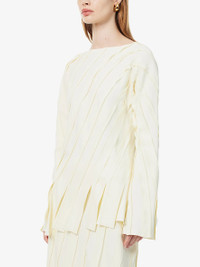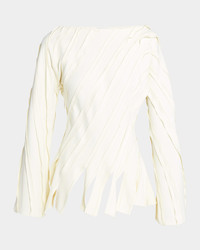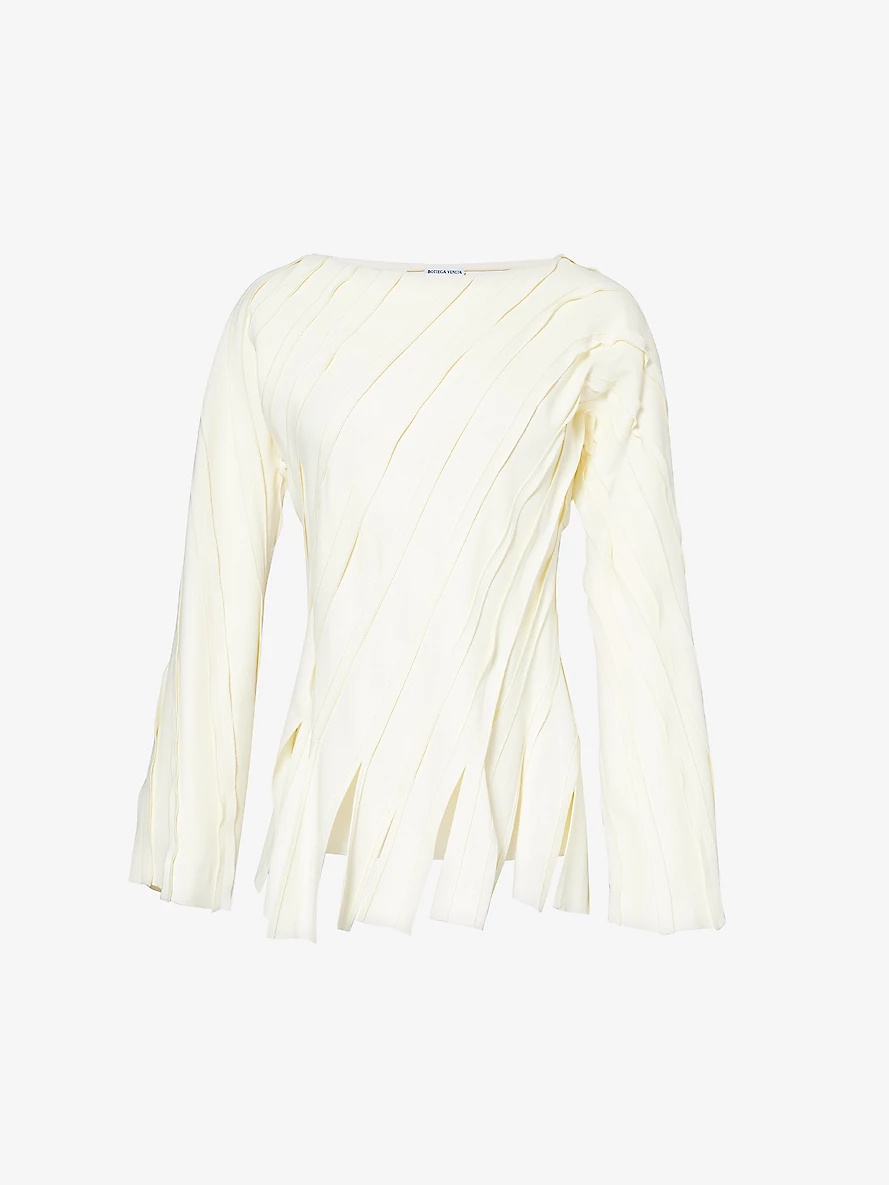 PRODUCT DETAILS - Bottega Veneta stretch-woven top - 96% viscose, 4% elastane - Concealed zip fastening at side - Regular fit, boat neckline, long sleeves, diagonal panel design - Specialist dry clean - Made in Italy - True to size - Size UK 8: length 27in / 69cm - Model is 5ft 10in/1.78m and wears a size UK 8 - Midweight, slight stretch Ref: R04281929