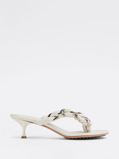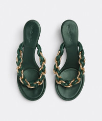 • Chain-braided leather sandals Material: 100% Lambskin • Unlined • Color: Inkwell • Hardware: Gold finish • Rubber-injected leather outsole Heel: 5.5 cm I 2" Made in: Italy