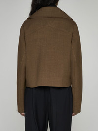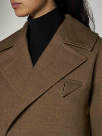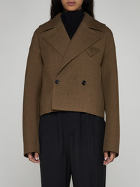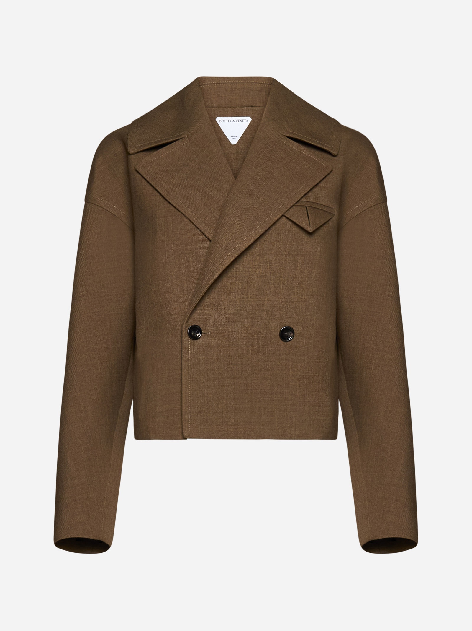 Bottega Veneta's double-breasted cropped jacket in melange brown wool featuring notched lapels, chest pocket with triangle flap, dropped shoulders and side pockets. Color: Gingersnap melange Size and fit: Model is 175 cm tall and wearing a size IT 40 Composition: 99% wool 1% silk Country of manifacture: Italy ID designer: 686152V34N02627