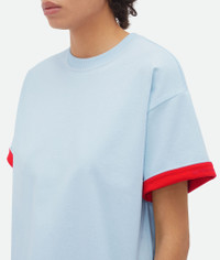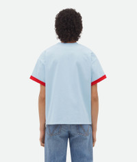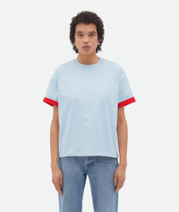 Product Details - Double-layer cotton jersey crew neck T-shirt - "BV" embroidery on interior sleeve - Relaxed fit - Material: Cotton - Color: Bubble/Tulip - Made in: Italy - Product code: 744990V16E04034 Size & Fit - Model is 178 cm | 5'10" and is wearing a Bottega Veneta size S