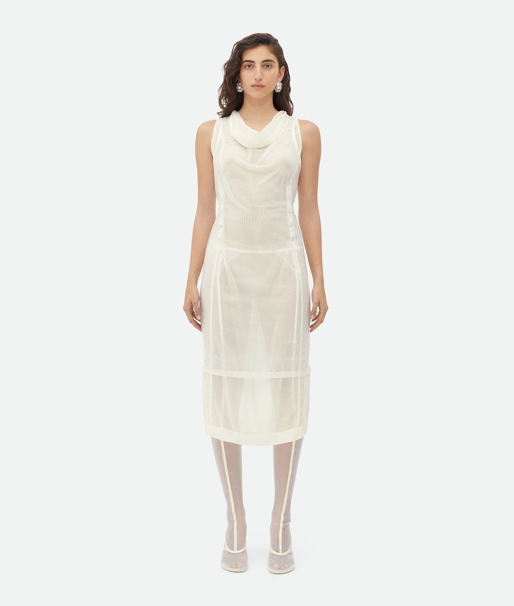 Light cotton and nylon double layer midi dress. Product details • Light cotton and nylon double layer midi dress • Tie closure • Regular fit Material: 100% Cotton • Color: Chalk Made in: Italy Size & fit • Model is 178 cm | 5'10" and is wearing a Bottega Veneta size 38