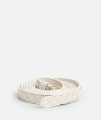 Intrecciato nappa leather belt with watch buckle. Product Details - Prong closure - Material: lambskin, calfskin - Lining: Calfskin - Color: Chalk - Hardware: Muse Brass finish - Height: 1.5 cm | 0.8" - Depth: 0.5 cm | 0.2” - Made in: Italy - Product code: 805582V4R019104
