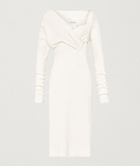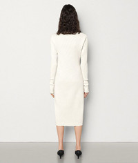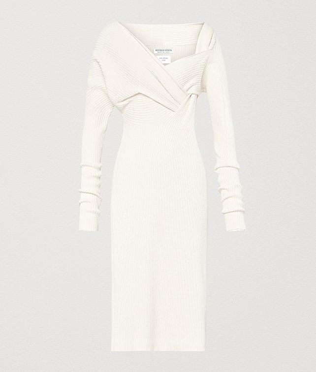 Woven knit dress • Dress in intrecciato-inspired woven knit • Twisted neckline • Elongated sleeves DETAILS Composition: 40% Silk, 30% Polyamide, 20% Acrylic, 9% Wool, 1% Polyurethane Color: Off-White Made in Italy