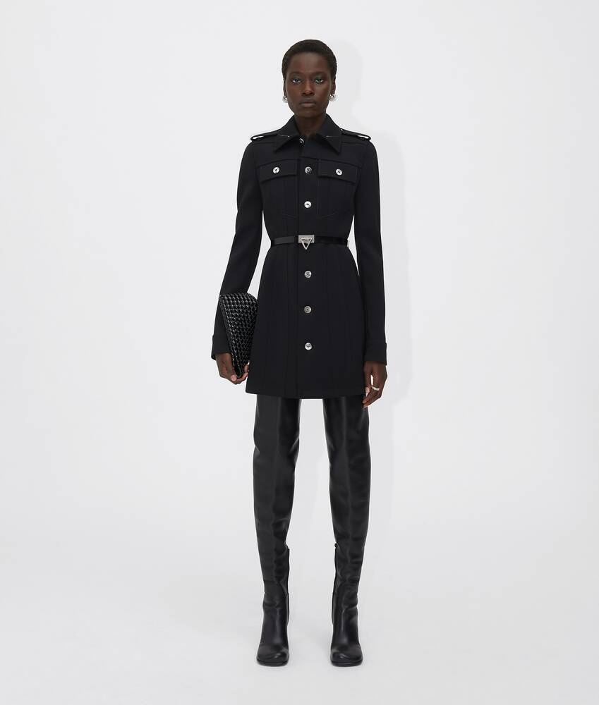 • Bonded stretch cavalry wool dress • Tonal top stitching in rubber thread • Detachable triangular metal plates in collar pockets • Button closure • Unlined • Slim fit Material: 90% Virgin Wool, 8% Polyamide, 2% Elastane • Color: Black Made in: italy