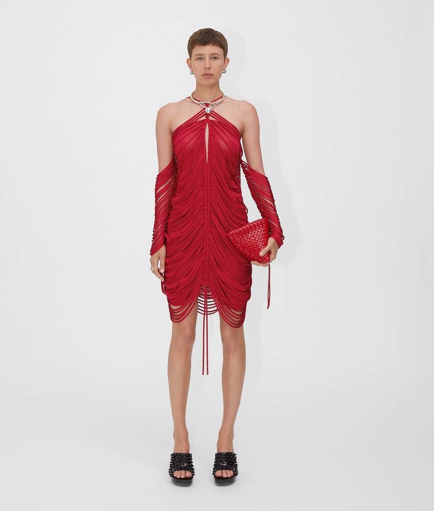 • Knitted fringe dress • Fine viscose yarn with knitted fringes • Fully lined • Slim fit Material: 96% Viscose, 4% Polyamide • Color: Scarlet Made in: italy