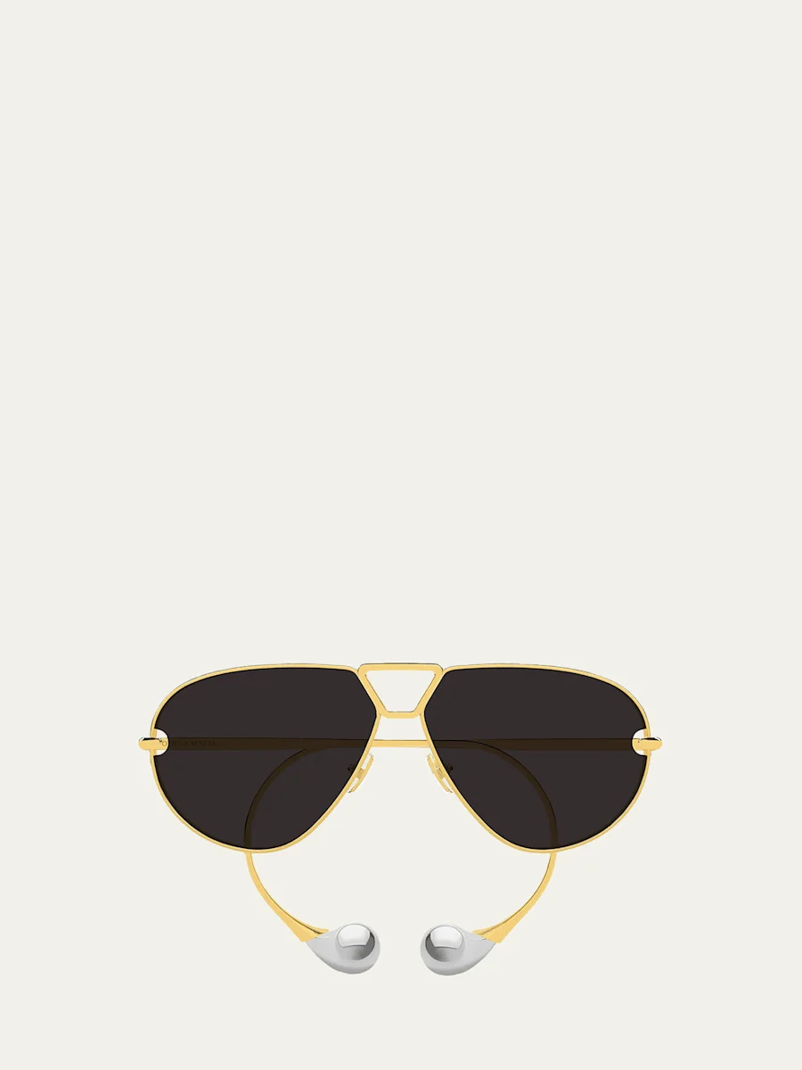Bottega Veneta "BV1437S" aviator sunglasses crafted from silver and goldtone metal Eye/bridge/temple (in mm): 6412185 Solidcolored lenses Adjustable nose pads Signature dropshaped temple tips Metal 100% UVA/UVB protection Made in Italy