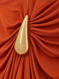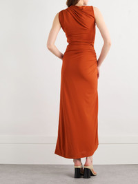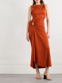 Bottega Veneta's maxi dress is designed with sculptural gold-tone hardware at the hip and shoulder, highlighting the gathered details. It's made from crepe-jersey that gently skims the figure before falling to a floaty, asymmetric hem and has an elegant bateau neckline. The fabric is derived from FSC viscose, which is turned into a fiber using the pulp from trees in responsibly managed forests.- By purchasing this product, you are supporting responsible leather manufacturing through Leather Working Group. Size & Fit - Fits true to size, take your normal size - Intended for a slim fit - Lightweight, stretchy fabric - Model is 180cm/ 5'11" and is wearing an IT 40 Model measurements: - Bust: 81cm/ 32" - Waist: 63cm/ 25” - Hip: 90cm/ 35.5” Details & Care - Dark-orange crepe-jersey - Concealed zip fastening along side - 100% viscose - Dry clean