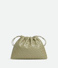 Intrecciato calfskin leather dustbag with transformable strap. Product Details - Single main compartment - Drawstring closure with leather loop attachement for shoulder carry - Material: calfskin - Lining: Nylon - Color: Travertine - Height: 23 cm | 9” - Width: 32 cm | 12.6” - Depth: 1 cm | 0.4” - Strap drop: 35 cm | 13.8” - Made in: Italy - Product code: 796728V3IV12916