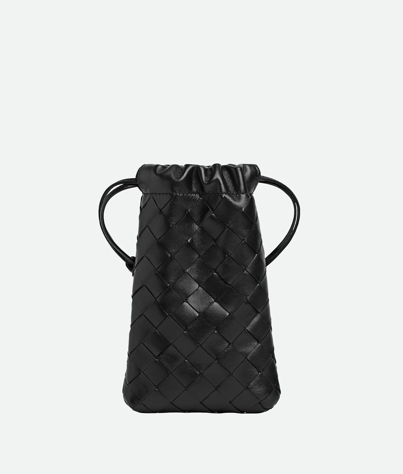 Product Details - Intrecciato calfskin leather case - One main compartment - Drawstring closure - Leather loop attachment with snap button to be easily attached to any handle - Lining: Suede - Color: Black - Hardware: Gold finish - Made in: Italy - Product code: 843968V3IV08425 Material - Material: Calfskin Size & Fit - Height: 19 cm | 7.5" - Width: 11 cm | 4.3" - Depth: 2 cm | 0.8" - Strap drop: 12 cm | 4.7"