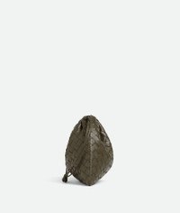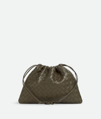 Product Details - Intrecciato calf leather pouch - One main compartment - Drawstring closure - Leather loop attachment with snap button for shoulder carry - Lining: Nylon - Color: Cypress - Hardware: Gold finish - Height: 23 cm | 9.1" - Width: 32 cm | 12.6" - Depth: 1 cm | 0.4" - Strap drop: 35 cm | 13.8" - Made in: Italy - Product code: 796728V3IV13228