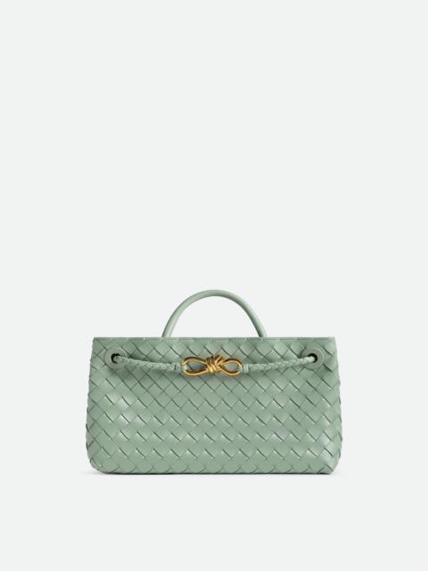 Top handle bag with elongated silhouette in supple Intrecciato leather with signature Product Details - East-West Intrecciato leather top handle bag with sliding cross-body strap - Compartmented interior with one zippered pocket, two open pockets - Magnetic closure - Material: lambskin - Lining: Lambskin bonded Intrecciato - Color: New Sauge - Hardware: Brass finish - Height: 18 cm | 7.1" - Width: 29 cm | 11.4" - Depth: 10 cm | 3.9" - Handle drop: 8 cm | 3.1" - Strap drop: 55.5 cm | 21.9" - Made in: Italy - Product code: 766010VCPP13411