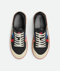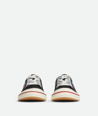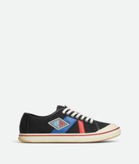 Low-top lace-up sneaker in canvas with leather trims. Product Details - Canvas low-top lace-up sneaker with leather trims - Special label on the side - Material: Cotton, calfskin - Lining: Cotton - Color: Black - Rubber outsole - Made in: Italy - Product code: 838383V5JG11000