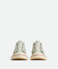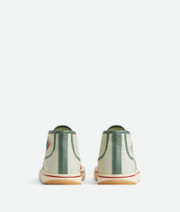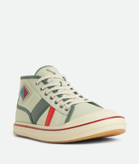 Mid-top lace-up sneaker in canvas with leather trims. Product Details - Canvas mid-top lace-up sneaker with leather trims - Special label on the side - Material: Cotton, calfskin - Lining: Cotton - Color: White Jade/Aloe - Rubber outsole - Made in: Italy - Product code: 827624V5JG13030