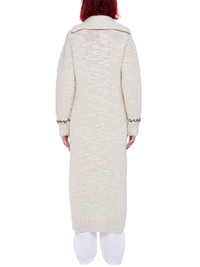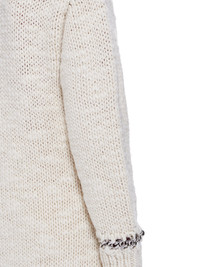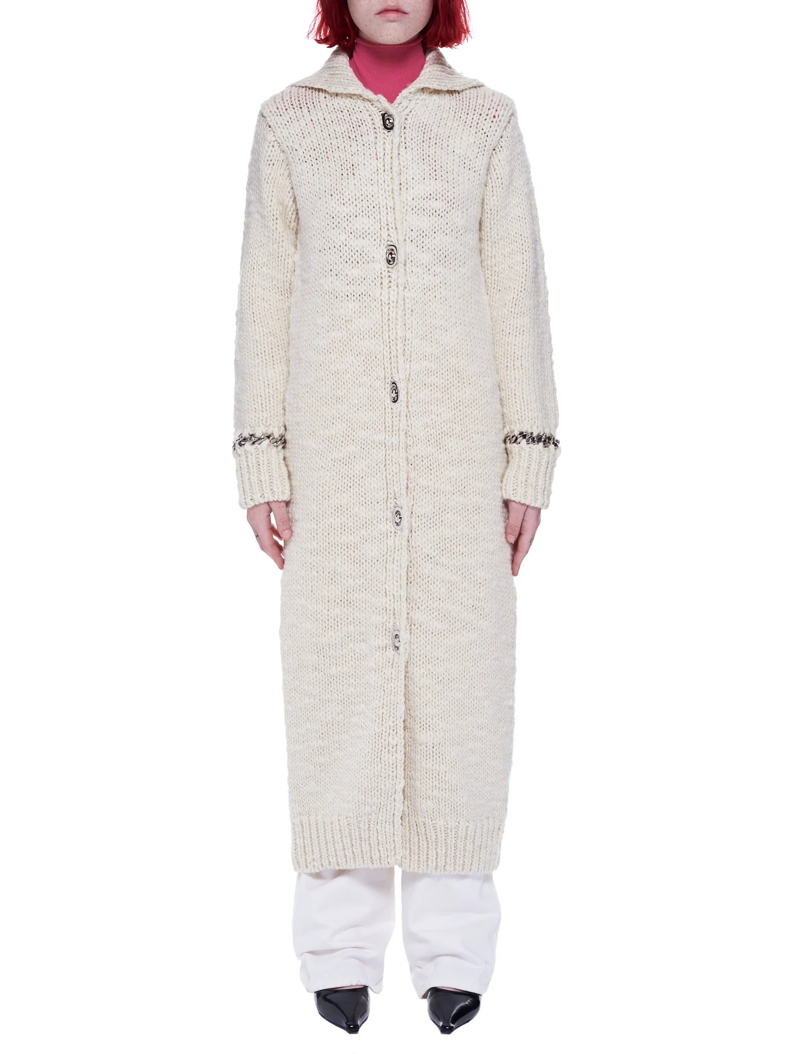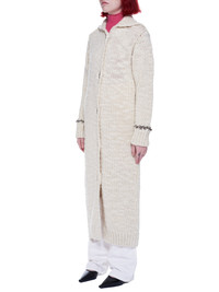 Bottega Veneta wool cardigan sweater in ecru, elongated length, spread collar, snap button closure, silver-tone hardware, chain detailing along the sleeves, straight/finished hem, tonal stitching. Made in Italy. Composition - 88% Wool, 12% Polyamide Model is 5ft 8” and wearing a size S. Bust: 32” Waist: 23” Hip: 32”