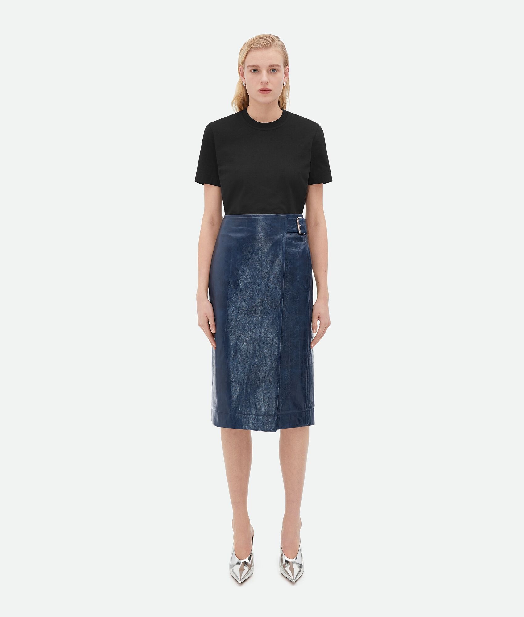 Embossed eel nappa leather midi skirt. Product details • Embossed eel nappa leather midi skirt • Double belt closure • Unlined Material: 100% Lambskin • Color: Mistral Made in: Italy Size & fit • Model is 179 cm | 5'10" and is wearing a Bottega Veneta size 38