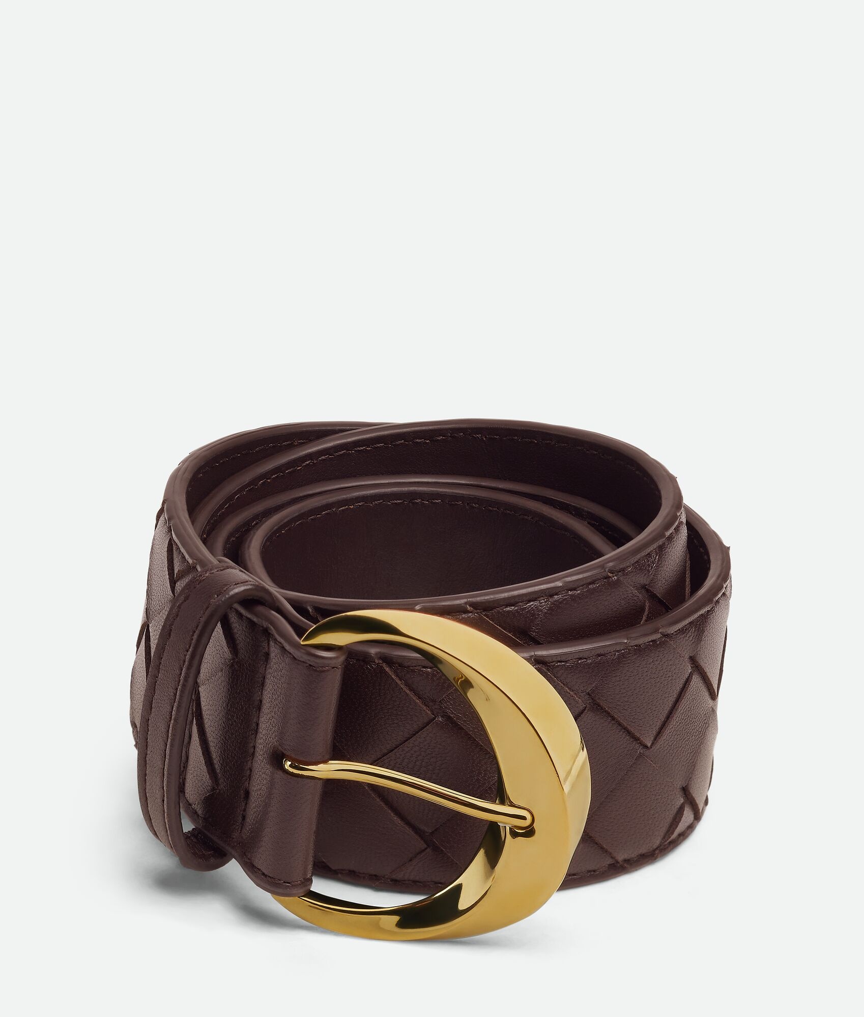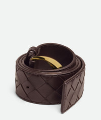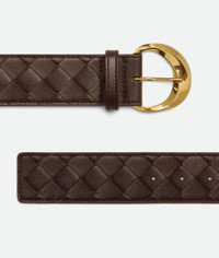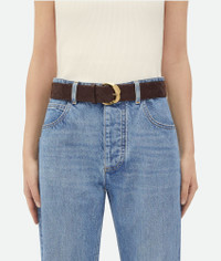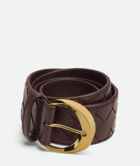 Intrecciato lambskin leather belt with essential twist buckle. Product Details - Prong closure - Material: Calfskin - Lining: Calfskin - Color: Fondant - Hardware: Muse Brass finish - Height: 4 cm | 1.6" - Depth: 0.5 cm | 0.2" - Made in: Italy - Product code: 786130V2ZL42190