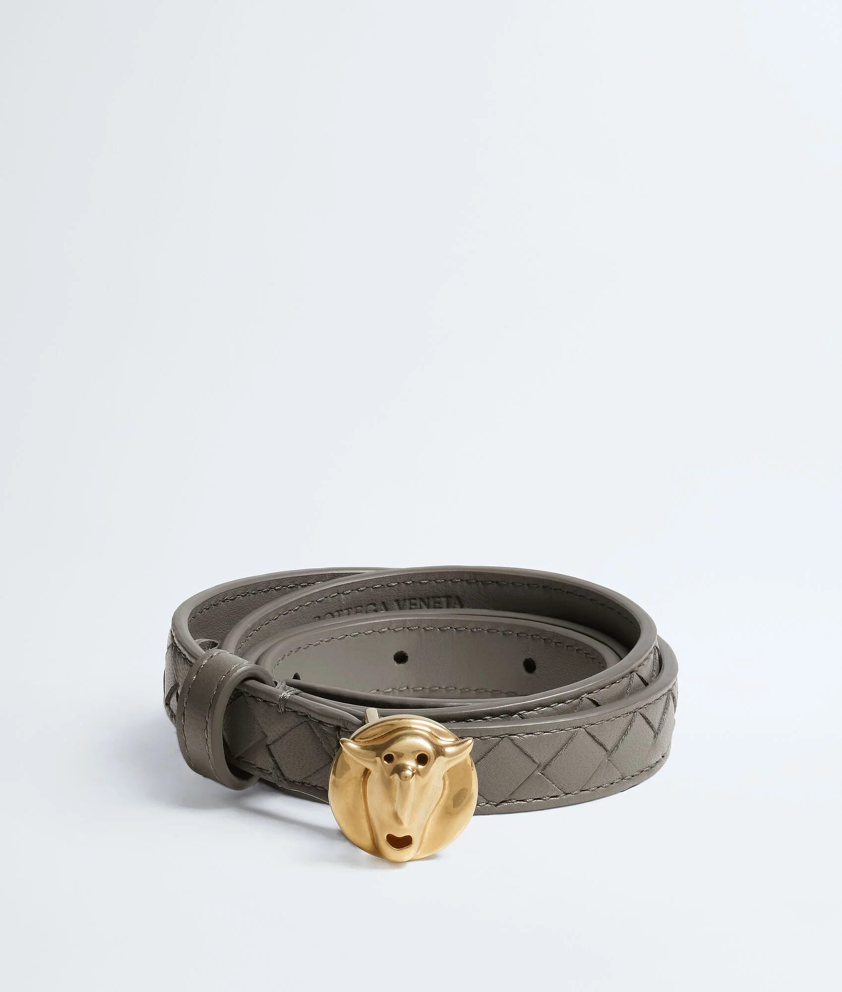 Belt in Intrecciato nappa leather with abstract face detailing on the metal buckle. Product Details - Intrecciato leather belt - Metal buckle with face detail - Pin closure - Lining: Light Calf - Colour: Basalt - Hardware: Brass Vibrato finish - Made in: Italy - Product code: 867591V0HW51647 Material - Material: calfskin Size & Fit - Height: 1.5 cm | 0.4" - Width: 1.5 cm | 0.4" - Depth: 0.5 cm | 0.2"