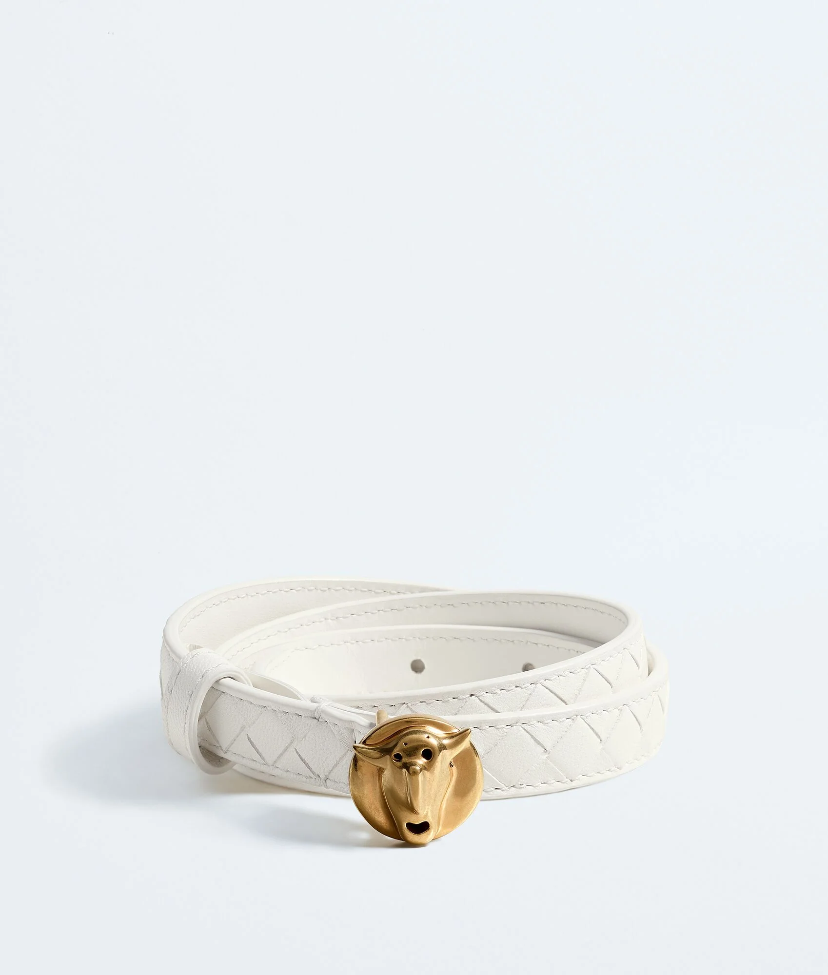 Belt in Intrecciato nappa leather with abstract face detailing on the metal buckle. Product Details - Intrecciato leather belt - Metal buckle with face detail - Pin closure - Lining: Light Calf - Colour: Alabaster - Hardware: Brass Vibrato finish - Made in: Italy - Product code: 867591V0HW59538 Material - Material: calfskin Size & Fit - Height: 1.5 cm | 0.4" - Width: 1.5 cm | 0.4" - Depth: 0.5 cm | 0.2"