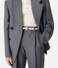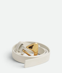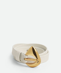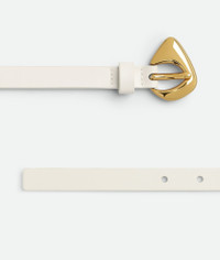 Calfskin leather belt with fin buckle. Product Details - Buckle closure - Material: calfskin - Lining: Calfskin - Color: Chalk - Hardware: Muse Brass finish - Height: 1.5 cm | 0.6” - Depth: 0.5 cm | 0.2” - Made in: Italy - Product code: 805780VALKO9104