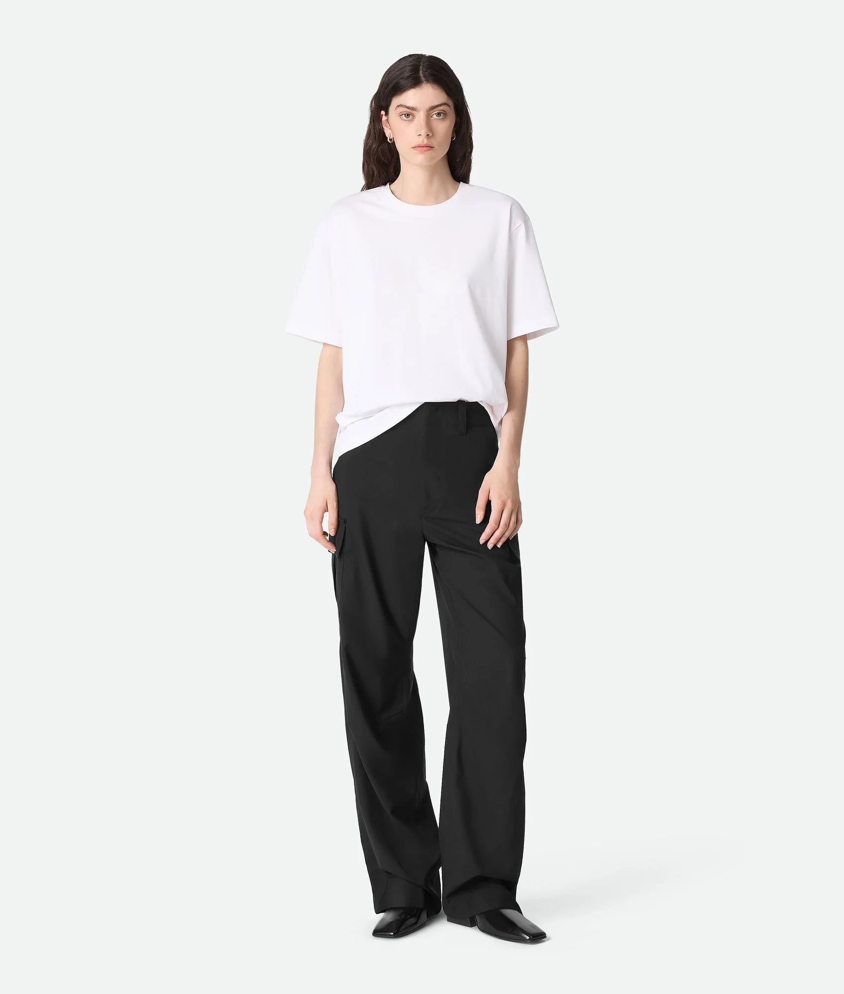 Cargo trousers with wide leg in fine wool. Product Details - Fine wool cargo pants - Wide leg - Mid waist - Zipper, hook and button closure - Color: Black - Made in: Italy - Product code: 845972V4XP01000 Material - Material: 100% Wool Size & Fit - Model is 178 cm | 5'10" and is wearing a Bottega Veneta size 38