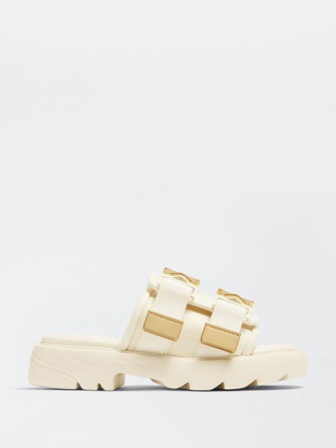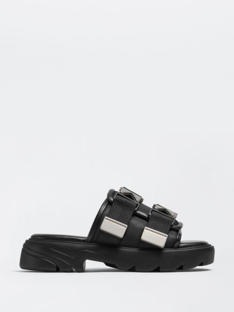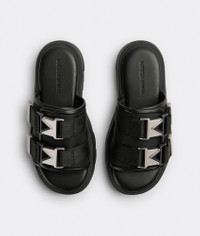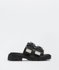 Padded technical fabric flat sandals. Product details • Padded technical fabric flat sandals • Decorative buckle Material: 100% Lambskin • Lining: Sporty mesh fabric • Color: Black • Hardware: Silver finish • Ultra lightweight rubber outsole • Platform: 4.5 cm | 1.8" Made in: Italy