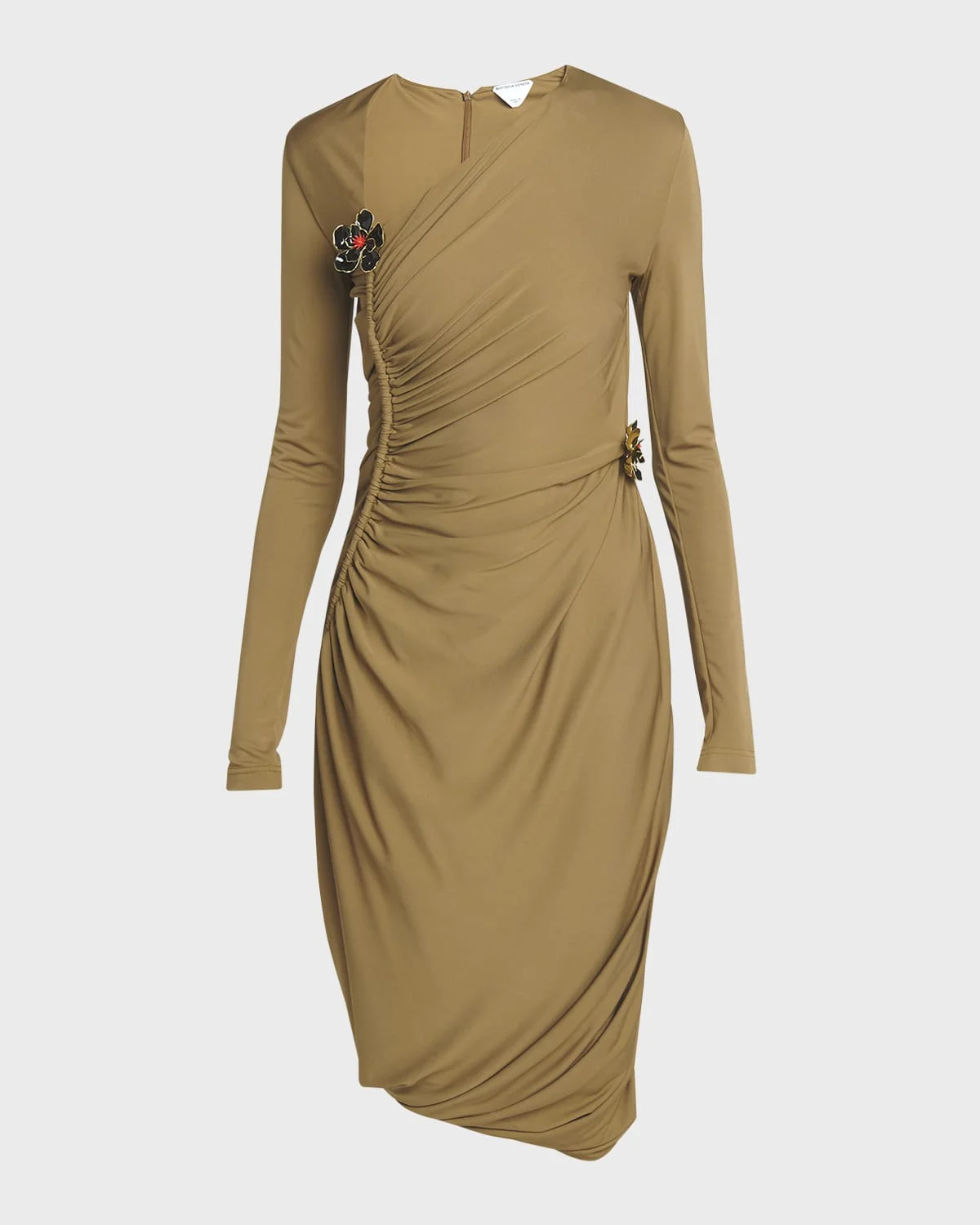 Bottega Veneta matte crepe jersey dress featuring a flower brooch, side ruching, and a twisted draped hem Asymmetric V neckline Long sleeves Knee length Sheath silhouette Invisible back zip Viscose/polyester Made in Italy