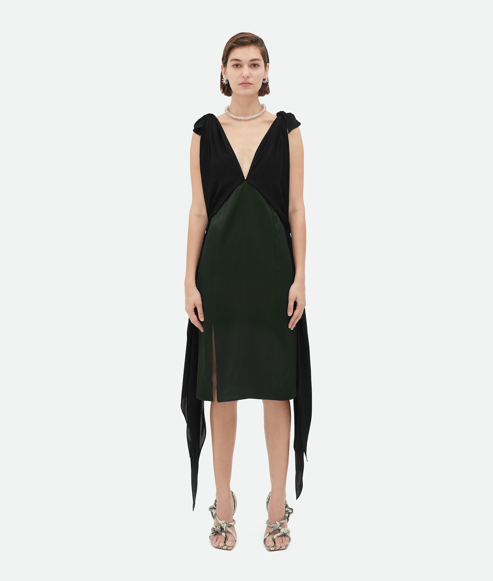 Fluid silk twill midi dress. Product details • Fluid silk twill midi dress • Knot detail on shoulders • Zipper closure • Unlined • Regular fit Material: 100% Silk • Color: Camping Made in: Italy Size & fit • Model is 178 cm | 5'10" and is wearing a Bottega Veneta size 38
