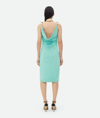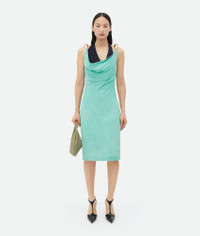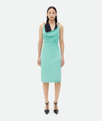 Fluid suede midi dress. Product details • Fluid suede midi dress • Metal detail on shoulder • Zipper closure • Unlined • Regular fit Material: 100% Lambskin • Color: Celadon/Dark Navy Made in: Italy Size & fit • Model is 177 cm | 5'9" and is wearing a Bottega Veneta size 38