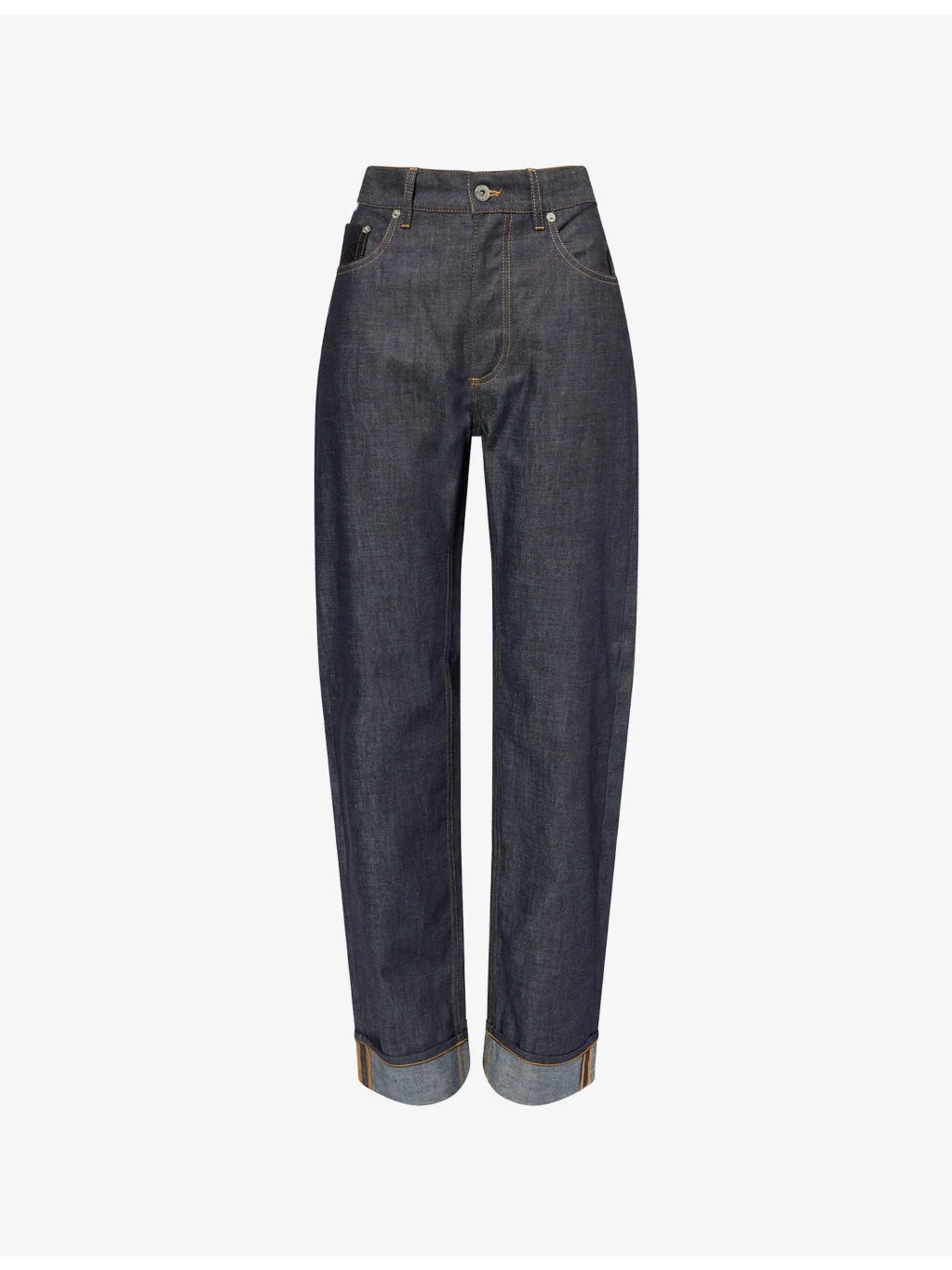 PRODUCT DETAILS - Bottega Veneta denim jeans - 100% cotton; embellishments 100% cow leather; pocketlining 65% polyester, 35% cotton - Exposed button and concealed zip-fly fastening at front - Regular fit, high-rise, straight leg, belt loops, five pockets, double-faced weave suede pocket at front, contrast stitching, folded cuffs - Machine wash at 30°C - Made in Italy - True to size - Size UK 8: rise 12in / 32cm, inside leg 32in / 82cm, leg opening 16in / 41cm - Model is 5ft 10in/1.78m and wears a size UK 8 - Lightweight, slight stretch Ref: R04462021