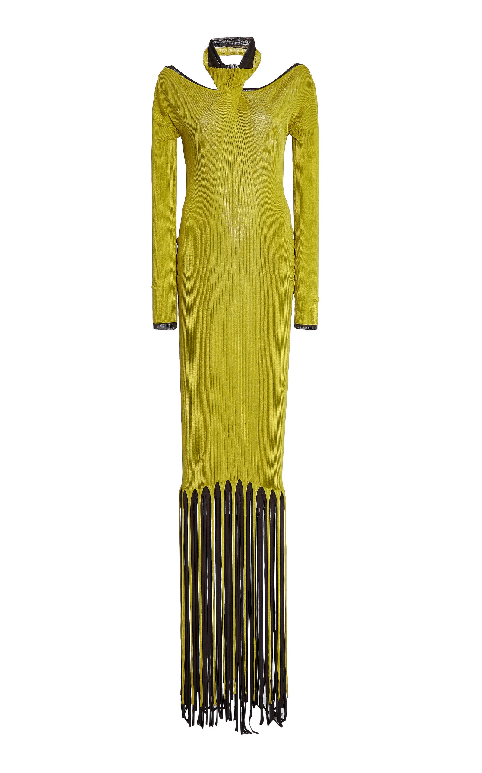 Fringe-Trimmed Ribbed-Knit Maxi Halter Dress green