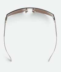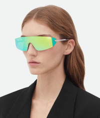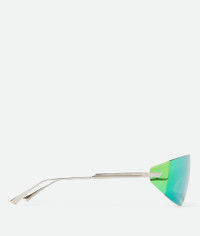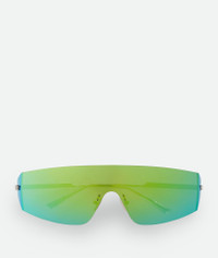Shield sunglasses in metal. Product Details - Flat top mask featuring a lens with integrated endpieces - Full metal temples - Nylon lenses - BV1299S 003 - Material: Metal - Color: Silver/Green - Made in: Italy - Product code: 791652V44501427